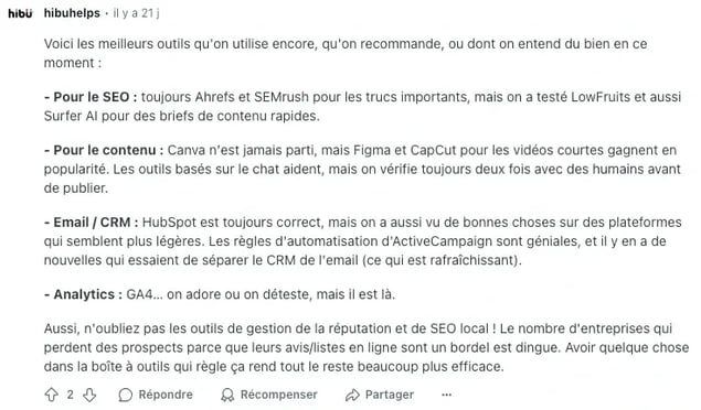 Exploitez Reddit Answers en parallèle : vos contributions détaillées et bien argumentées peuvent être directement valorisées par l'IA de Reddit, sans passer par Google. Un canal supplémentaire, pas une solution unique.